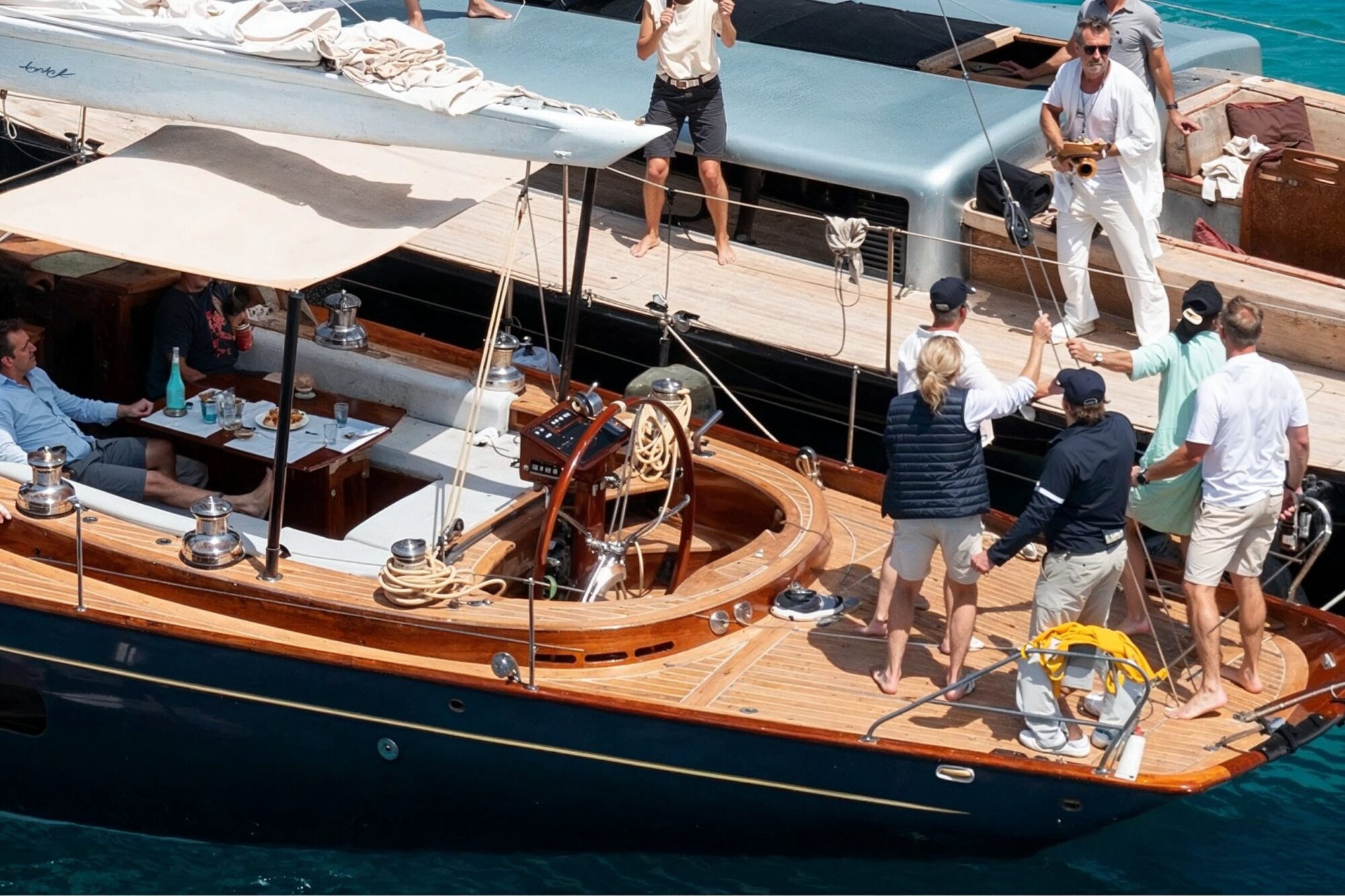Our friend joins the gathering with his sailing yacht, and together we sail towards a secluded bay. The sun is high, the sails are full, and the sea is sparkling. Dolphins swim alongside us, making the day even better.